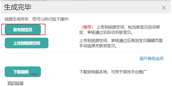 当我们点击“开始生成”后,等待一段时间会出现下方所示的弹出框,主需要点击“发布到宝贝”即可完成发布。