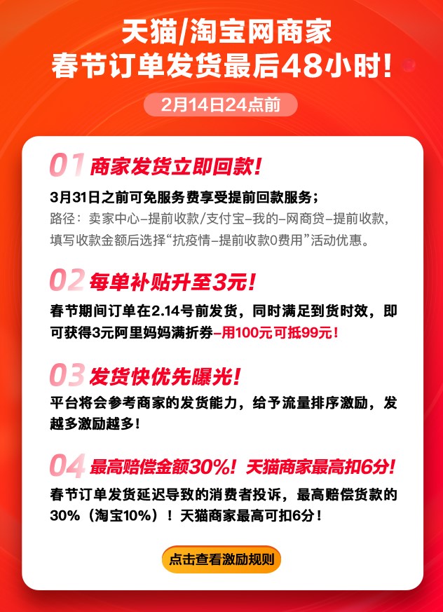 答:经淘宝评估确认后,每一笔真实妥投并符合激励要求的订单,卖家将获得满折券的激励。每笔订单仅可获得1次激励。具体激励规则:① 在2020年2月5日23:59:59前完成发货并有揽收记录的订单,符合激励要求的,将获得1元激励金额,该金额将以阿里妈妈满折券形式发放到受激励卖家的阿里妈妈超级推荐账户内;②在2020年2月6日00:00:00至2020年2月9日23:59:59完成发货并有揽收记录的订单,符合激励要求的,将获得2元激励金额,该金额将以按照50%:50%的分配比例以阿里妈妈满折券形式发放到受激励卖家的阿里妈妈直通车和超级推荐账户内。③在2020年2月10日00:00:00后完成发货并有揽收记录的订单,符合激励要求的,将获得3元激励金额,该金额将以按照50%:50%的分配比例以阿里妈妈满折券形式发放到受激励卖家的阿里妈妈直通车和超级推荐账户内。订单是指买家向单一卖家同一时间拍下单款或多款商品的合约。