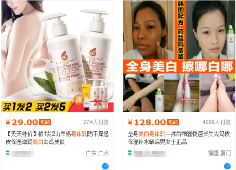 第二张图使用对比方式,之前图片上人物肤色比较黑,右边图片是使用商品后的美白效果,视觉上的使用前、使用后的对比鲜明比较有冲击力。这样的图来介绍商品要比说使用了什么原料什么成分等等更有说服力,因为买家第一眼就看到了自己想要的结果。